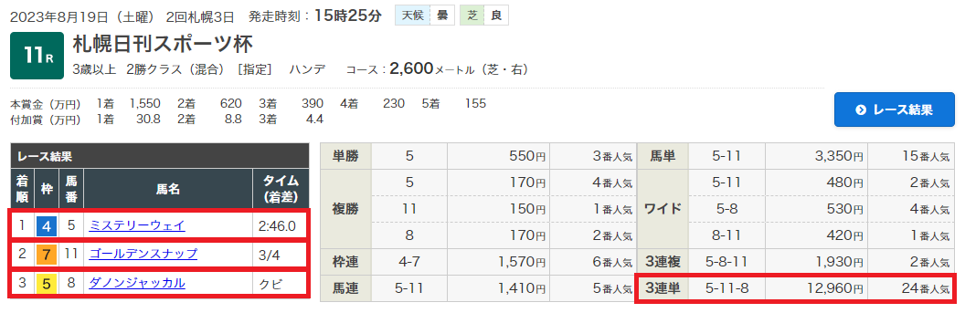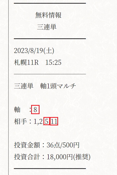 19日(土)札幌11Rで無料情報3連単129.6倍的中!