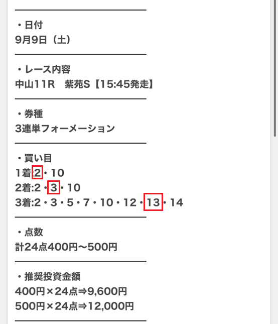 9日(土)紫苑S(G3)で無料情報3連複204.1倍、