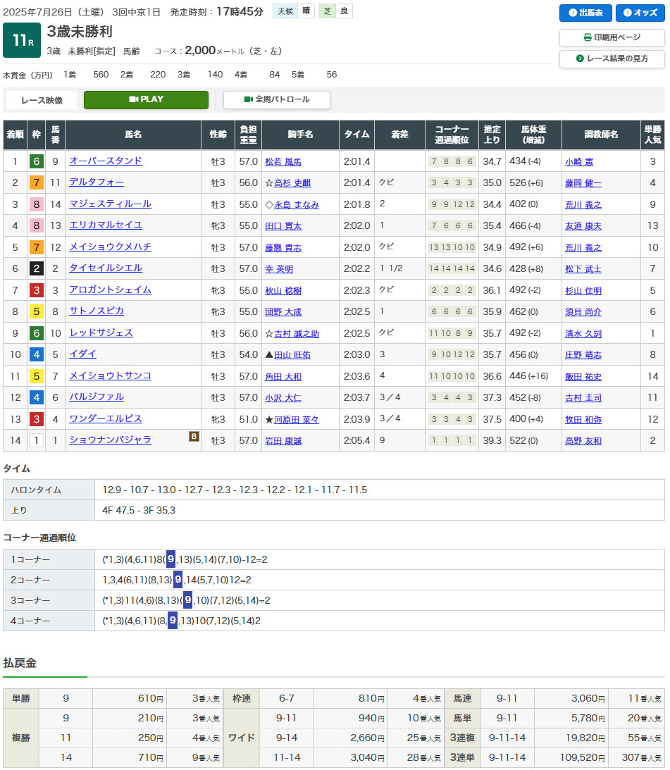 このレースは逃げ・先行勢が総崩れ、逃げた①ショウナンバジャラは最下位。