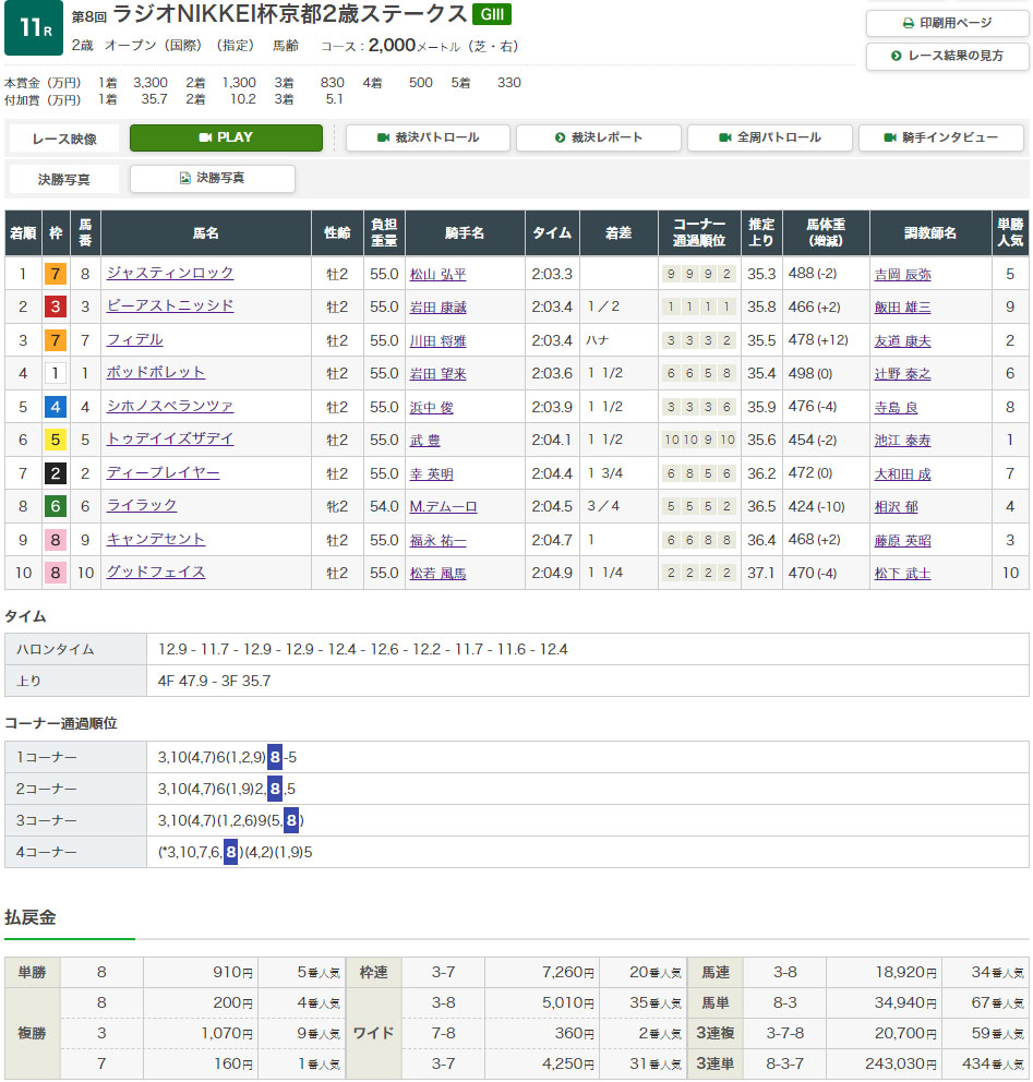 2レース情報提供のうち、まずは11/27(土)1Rの重賞 ラジオN杯京都2歳Sから検証。