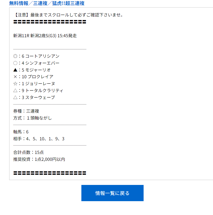 日曜日の無料情報で新潟2歳S(G3)3連複的中貰えました、ちょい荒れで6万1600円ゲットできました。
