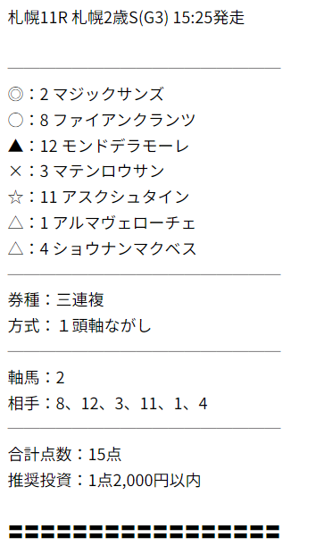 ちょい荒れ札幌2歳ステークス無料でゲット!ってか3鞍3的中でパーフェクト! 重賞的中含む20万3800円払い戻しでした! 使い勝手最高のパーフェクト無料予想でした!
