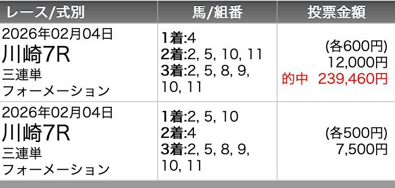1レース目は本命馬で決まり高配当を本当にありがとうございました!2レース目は3着に買い目のない馬がきてしまい不的中だったけど軸馬はしっかり2着にきていました。しっかりと研究されていることが伝わる予想で心から信頼できるサイトです。