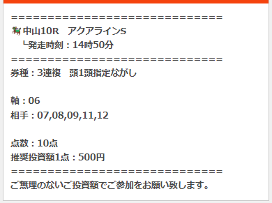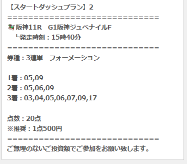 管理人さんが試されていたスタートダッシュプラン使ってみました。 推定配当30~50万でどんな結果になるか楽しみな週でした、結果は 3発3的中で38万1250円払戻し。 情報参加費用9,800円。 3鞍馬券代29,000円。 回収率→982% 情報料+馬券代を差し引いても→+34万2450円収支。 画像が1枚しか張れなかったので重賞の買い目だけを貼っておきます。 12/6土曜日 阪神10R妙見山ステークス/130,950円 12/7日曜日 阪神11Rりんくうステークス/119,350円 G1チャンピオンズカップ/130,950円